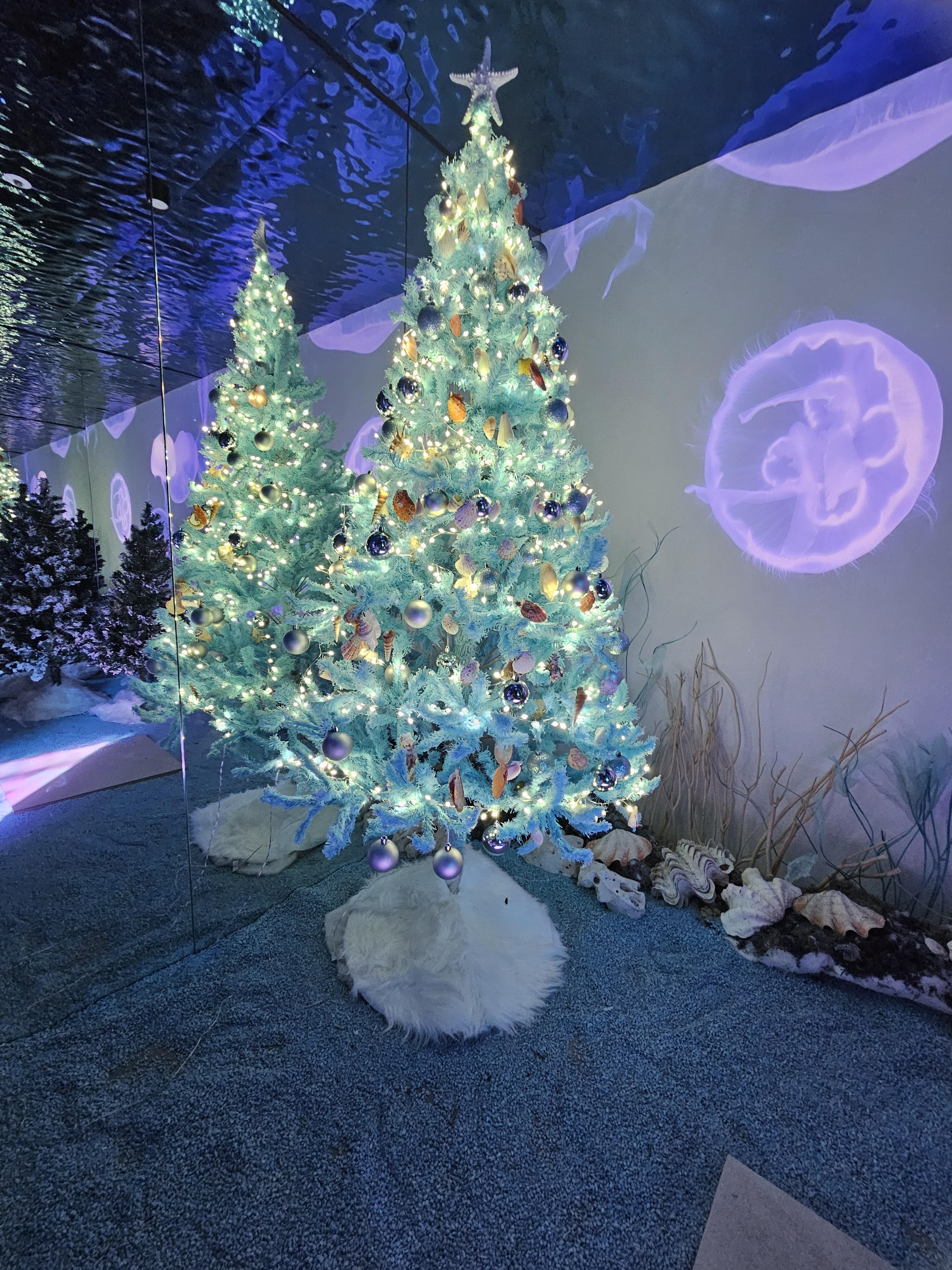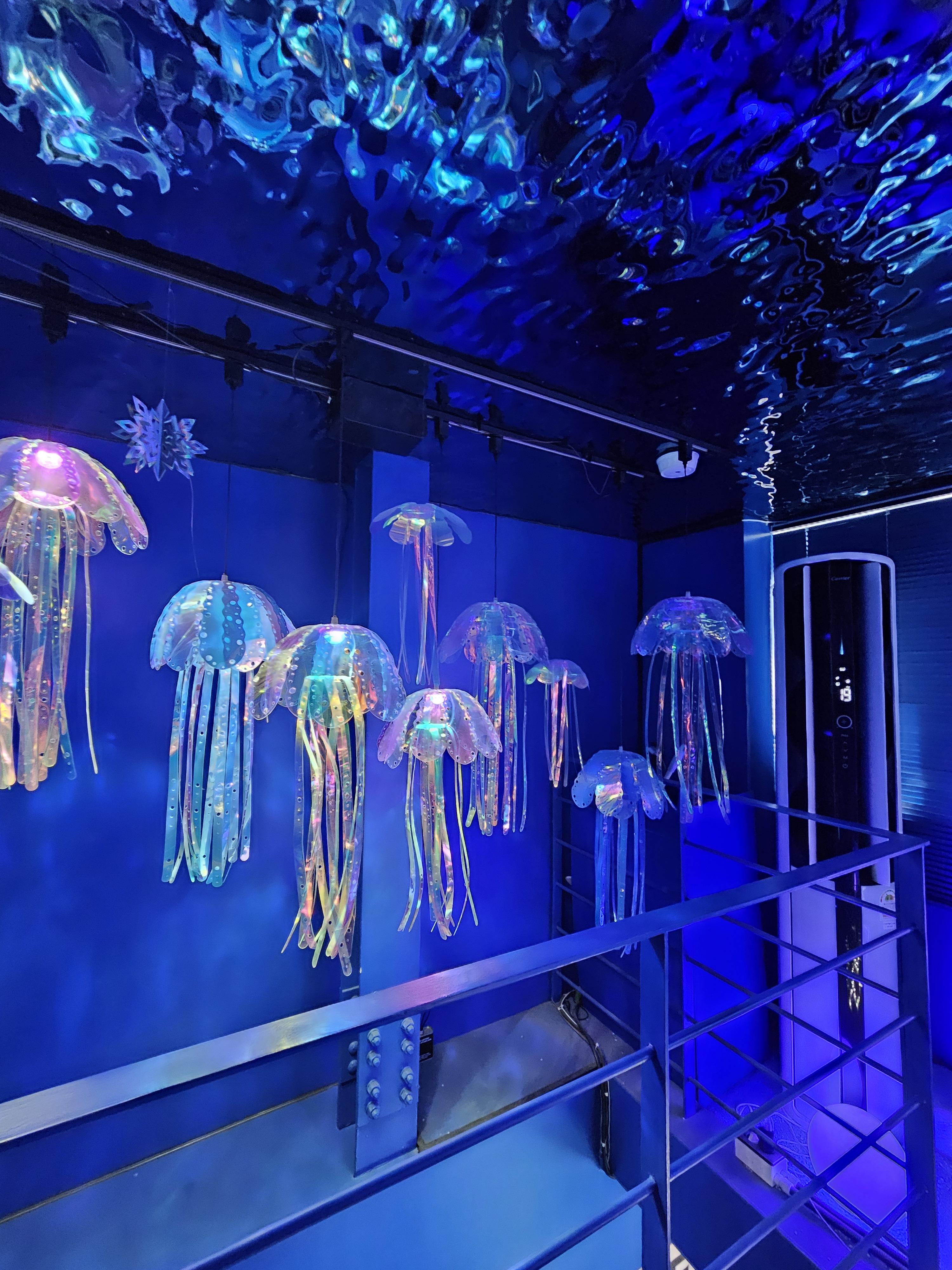 특히 울퉁불퉁한 천장은 파란 조명에 반사되어
